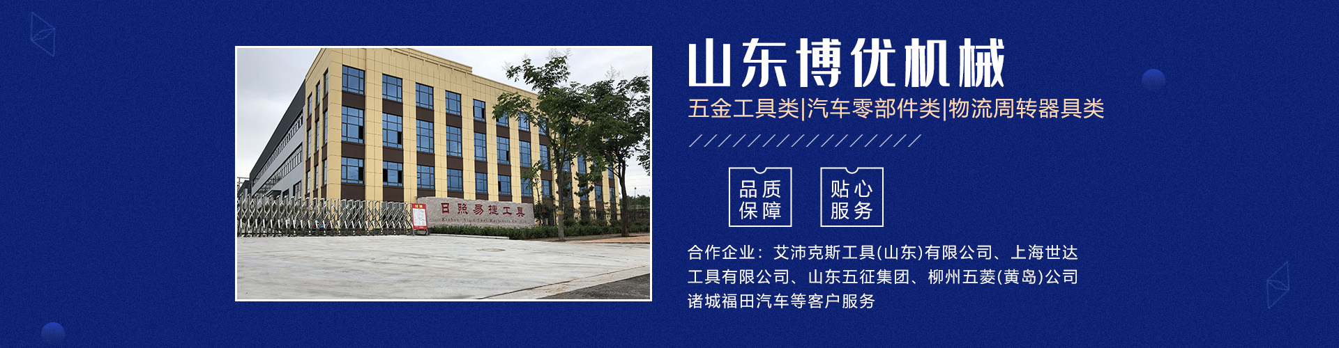 分公司日照易捷工具制造有限公司坐落在山東省日照市五蓮縣工業(yè)園,占地65畝(五蓮縣日照路與人民路交匯處),現(xiàn)有員工60名。公司主要產(chǎn)品有五金工具類(lèi)及汽車(chē)零部件類(lèi)、模具制作等三大系列。 主要設(shè)備有加工中心、數(shù)控車(chē)床生產(chǎn)線(xiàn)、磨床、研磨機(jī)、拋光機(jī)、冷鐓擠壓成型機(jī)、數(shù)控液壓模鍛錘等機(jī)械加工設(shè)備140余臺(tái)套。公司主要為艾沛克斯工具(山東)有限公司、上海世達(dá)工具有限公司、山東五征集團(tuán)、柳州五菱(黃島)公司、諸城福田汽車(chē)等客戶(hù)服務(wù)。公司多年被評(píng)為優(yōu)秀供應(yīng)商。